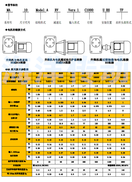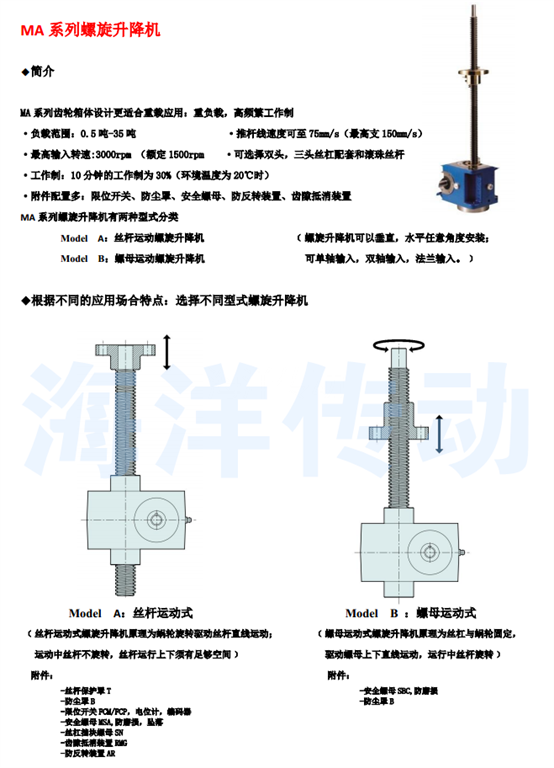 的設(shè)計,緊湊的鋁齒輪箱體,與 MA系列有低的價格額定負載: 0.5噸 - 20噸 推桿升降速度可至30mm/s 高輸入轉(zhuǎn)速:1500rpm 工作制:20%(10分鐘運行2分鐘)可選擇雙頭,三頭絲杠配套,參數(shù)咨詢我公司附件:齒隙抵消裝置,防轉(zhuǎn)轉(zhuǎn)置,安全螺母,防塵罩,磁感應(yīng)限位開關(guān) MA系列普通齒螺旋升降機 更適合重載應(yīng)用:重負荷,高頻繁工作制 額定負載: 0.5噸 -35噸 推桿升降速度可至75mm/s 高輸入轉(zhuǎn)速: 3000rpm 工作制:30%(10分鐘運行3分鐘)