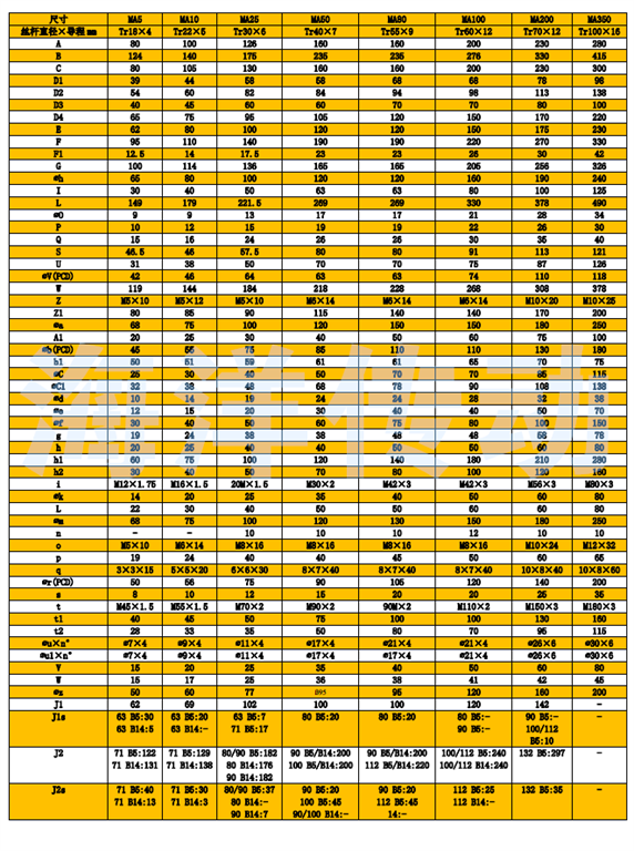 MA系列普通齒螺旋升降機 更適合重載應(yīng)用:重負荷,高頻繁工作制 額定負載: 0.5噸 -35噸 推桿升降速度可至75mm/s 高輸入轉(zhuǎn)速: 3000rpm 工作制:30%(10分鐘運行3分鐘) 可選擇雙頭,三頭絲杠配套,參數(shù)咨詢我公司 附件:齒隙抵消裝置,防轉(zhuǎn)轉(zhuǎn)置,安全螺母,防塵罩,磁感應(yīng)限位開關(guān)