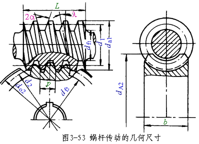如圖3-53所示,通過蝸桿軸線并垂直于蝸輪軸線的平面為主平面。在主平面上,蝸桿的齒廓與齒條相同,兩側邊為直線,夾角2a=40°;而蝸輪的齒廓為漸開線,即在主平面內(nèi),蝸桿與蝸輪的嚙合如同齒條與齒輪的嚙合一樣。因此,蝸桿傳動的主要參數(shù)和幾何尺寸計算大致與齒輪傳動相同,并且在設計、制造中皆以主平面上的參數(shù)和尺寸為基準。普通圓柱蝸桿傳動參數(shù)已標準化。