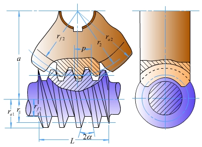 蝸輪蝸桿嚙合傳動中過蝸桿軸線且垂直于蝸輪軸線的剖面稱為主剖面,如圖5.8.2-1所示。在主剖面內(nèi)反映了蝸桿蝸輪的主要尺寸參數(shù),因此是著重研究的剖面。